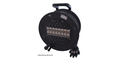 BUVD08/0-FDX15,0MX-K Bühnenunterverteilung 8 Inp. Stageboxronde schwarz, 8x D-Serie Kanalkennzeichnung: Siebdruckzahlen 1-8 Neutrik: 8x XLR fem. Einbbu. (NC3FD-LX) MTI Digital Multicore-Cable Cu.: 8x2x0,14 mm², sauerstoff-frei (O.F.C.) Wellenwiderstand: 110 Ohm Cu.-Leiterlitzen 0,10 mm, twisted pair PE-Leiterisolation, Einzelpaarmäntel Cu.-Wendelschirm, Cu.-Ges.-Flechtschirm 98% Bedeckung, Kapazitäten: Leiter/Leiter 56 pF, Leiter/Schirm 105 pF Dämpfung: max. 2,3 dB/100 m Mantel: PVC, cadmium-/ bleifrei (RoHS) extrem flexibel, Durchmesser: 10,6 mm Mantelfarbe: schwarz Neutrik: 8x XLR male (NC3MXX) Kanalkennzeichung: Kabel: Klippzahlen 1-8 auf Kabeltrommel GT310.SBR Siebdruckzahlen: 1-8 Einzelmassenführung Spliss: 0,5 m, Länge: 15,0 m
